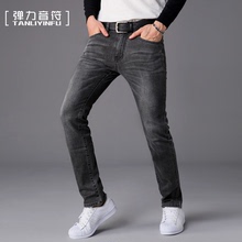 弹力音符高弹力深灰色牛仔裤男修身直筒弹性裤子韩潮男装长裤大码