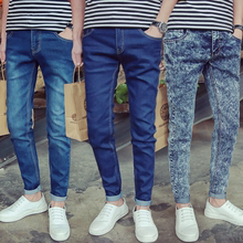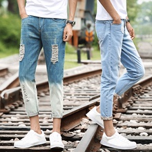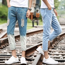青少年夏季薄款破洞九分牛仔裤男士小脚修身学生 9分乞丐哈伦裤子