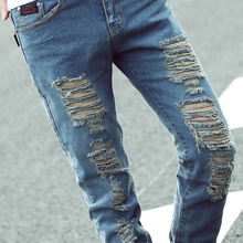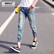 夏季薄款九分牛仔裤男装韩版修身小脚破洞乞丐哈伦束脚裤青少年