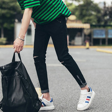 2017新款破洞牛仔裤男土黑色小脚修身型九分学生韩版潮流百搭裤子