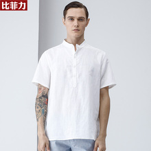 比菲力夏季新款男士短袖棉麻衬衫 男大码宽松立领薄款亚麻衬衣男