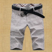 夏季男装棉麻中裤子薄款韩版修身青年夏天潮男士格子亚麻休闲短裤