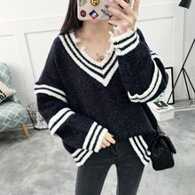 韩版秋冬宽松V领宽松套头破洞毛衣女士秋装上衣条纹拼接针织衫潮