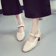 韩版复古一字扣包头凉鞋女夏新款中跟粗跟学生百搭浅口玛丽珍女鞋