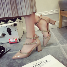 欧洲站2016夏季新款高跟鞋包头粗跟女凉鞋一字扣铆钉尖头罗马女鞋