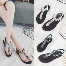 2017夏季新款韩版学生水钻串珠凉鞋女甜美珍珠夹脚平底公主罗马鞋