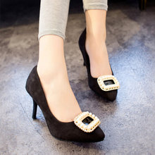 2016新款小香风水钻珍珠方扣绒面细跟尖头粉紫黑色高跟单鞋女潮