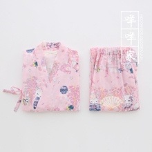 樱花猫。日式和服の客供水洗棉麻上衣+裤子睡衣家居服