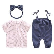 宝宝夏装套装女纯棉短袖薄款韩版0-1岁2婴儿背带裤三件套夏季衣服