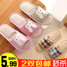 春夏季兔子亚麻拖鞋 防滑格子拖鞋居家男女士软底室内棉麻
