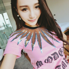 2017夏装新款欧洲海报款粉色闪闪亮片字母打底衫短袖T恤女上衣潮