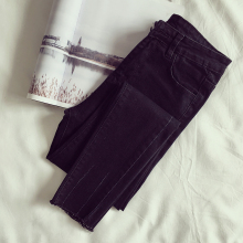 2017早春新款黑色高腰牛仔裤女长裤金属钉扣流苏边紧身大码铅笔裤