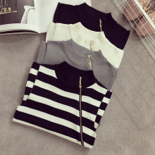 2017春夏新款时尚个性条纹圆领侧拉链针织背心女打底修身显瘦上衣