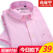 南极甲夏季牛津纺短袖衬衫男韩版修身纯色休闲短衬衣粉色半袖寸衫