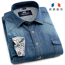朗蒙春季新款复古水洗纯棉牛仔长袖衬衫男士双口袋拼接衬衣男装潮