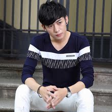 秋季青少年V领长袖t恤 男士韩版修身上衣服个性小衫潮流外穿秋衣