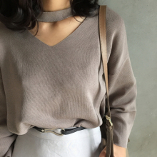 夏装新款镂空V领纯色宽松长袖上衣 韩国chic套头薄款针织衫外套女
