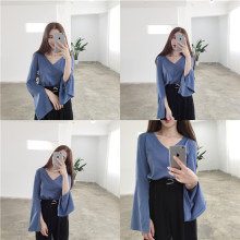 夏装韩国宽松纯色V领开叉喇叭袖针织T恤复古chic显瘦打底衫上衣女