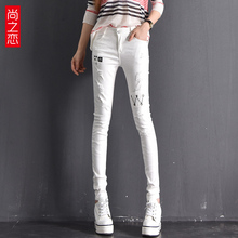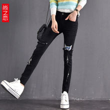 尚之恋破洞牛仔裤女春秋韩版小脚裤修身显瘦铅笔裤贴布高腰长裤潮