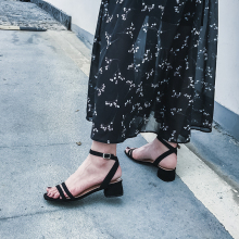 大叔家2017夏季新款韩版粗跟露趾一字式扣带凉鞋女罗马鞋夏季凉鞋