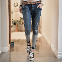 补丁拼接哈伦牛仔裤女 韩风弹力翻边磨破洞锥形裤瘦腿高腰束脚裤