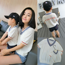 辰辰家亲子装T恤17夏新款母子母女装儿童学院风V领短袖针织衫上衣