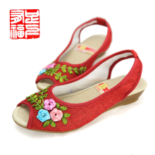 足下有福小花园绣花鞋正品民族风鱼嘴女鞋亚麻坡跟女凉鞋清仓