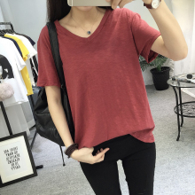 200斤胖mm大码V领短袖t恤女 胖妹妹宽松显瘦简约竹节棉体恤打底衫