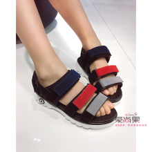 米米果家女童鞋2017夏新款26-37彩条魔术贴露趾凉鞋平底儿童鞋子