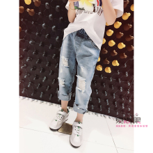 米米果家2017夏装新款百搭款中大女童破洞直筒裤牛仔裤儿童长裤子