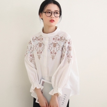 三木社民族风立领绣花衬衫女宽松后背褶皱灯笼袖长袖上衣2017春季