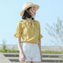三木社/露水轻舟/棉麻短袖条纹假两件衬衫拼接清新女上衣百搭文艺