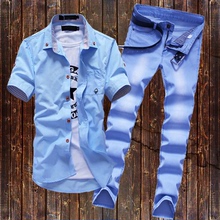 新款男装春夏季衬衫短袖男士衬衣牛仔长裤休闲一套装男搭配上衣服
