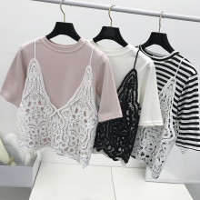 2017夏装新款韩版宽松钩花镂空蕾丝吊带背心+短袖t恤两件套上衣