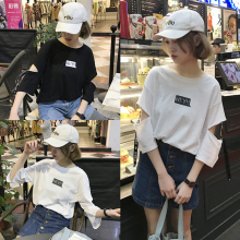 百搭小清新圆领七分袖T恤女春夏学院风宽松显瘦休闲镂空袖上衣潮
