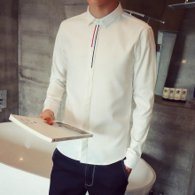 35y春季男士长袖刺绣衬衫青少年韩版修身衬衣潮男免烫白色打底衫