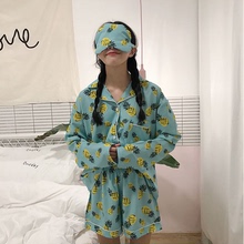 夏季韩版俏皮可爱菠萝印花睡衣眼罩长袖短裤家居服学生女三件套装