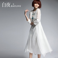 早春新款温婉中国风盘扣马蹄袖棉麻提花拼真丝收腰连衣长裙女