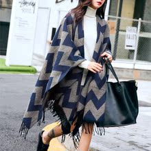 加厚披风女秋冬季 大牌欧美复古黑灰色流苏双面开叉大披肩围巾女