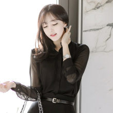 2017春夏季新款韩版黑色性感半透显瘦立领百搭雪纺衬衫长袖上衣女
