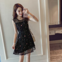 连衣裙夏季2017新款女学生韩版显瘦网纱刺绣花蕾丝裙无袖背心裙子