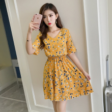 2017夏季新款女韩版时尚喇叭袖碎花修身显瘦短袖V领雪纺连衣裙