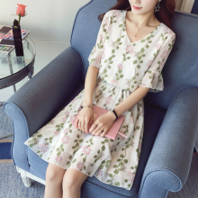 2017夏季新款女小清新喇叭袖文艺碎花修身显瘦短袖V领雪纺连衣裙