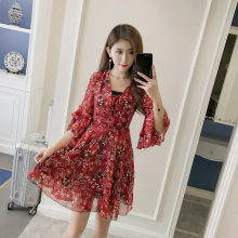 夏季新款韩版优雅气质碎花连衣裙仙女喇叭袖中长款打底雪纺裙潮
