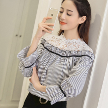 2017夏装新款条纹衬衫女蕾丝拼接露肩宽松学生娃娃衫喇叭袖上衣