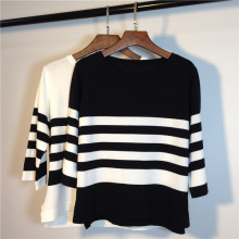 韩国女2017春装新款套头针织衫女装圆领七分袖黑白条纹上衣潮T恤