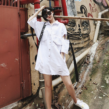 NANA港版街头风大破洞露肩设计宽松中长款厚T恤女春季卫衣外套
