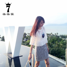 柒柒家2017新款女韩版甜美时尚夏蕾丝衬衫裙子两件套气质女套装