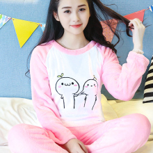 秋冬季法兰绒家居服加厚珊瑚绒睡衣女可爱卡通圆领甜美家居服