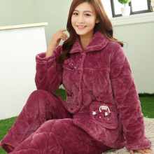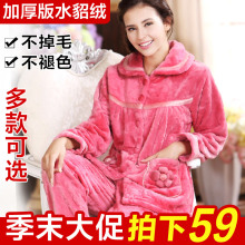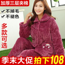 冬季三层加厚法兰绒夹棉睡衣女冬天加绒抗寒珊瑚绒棉袄家居服套装